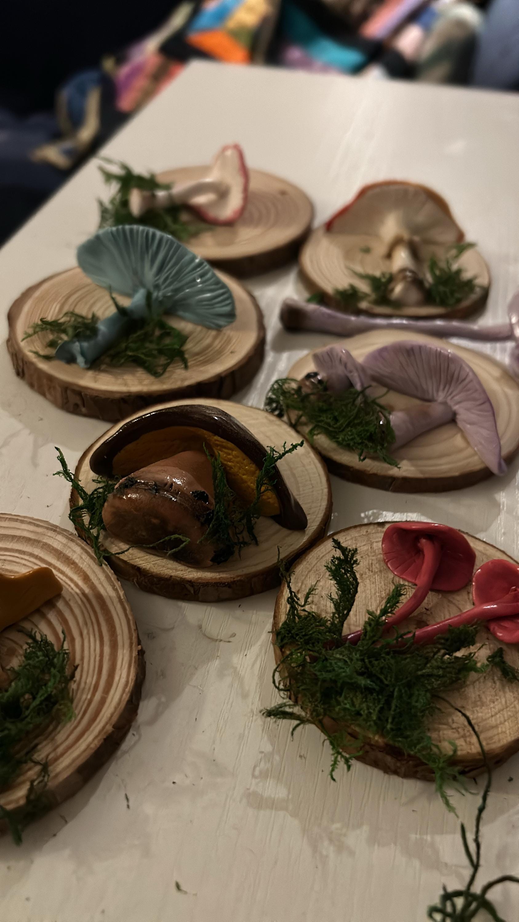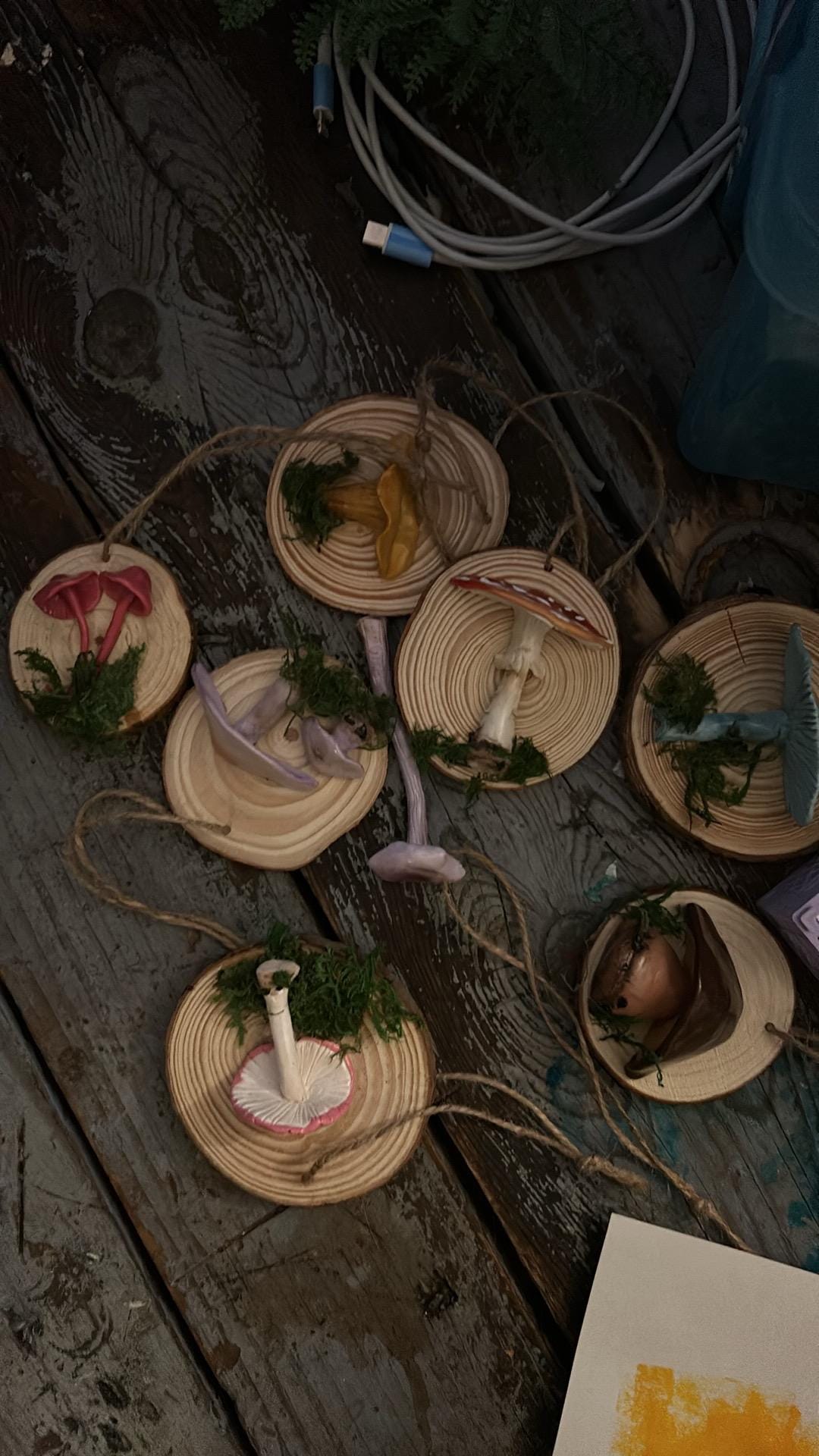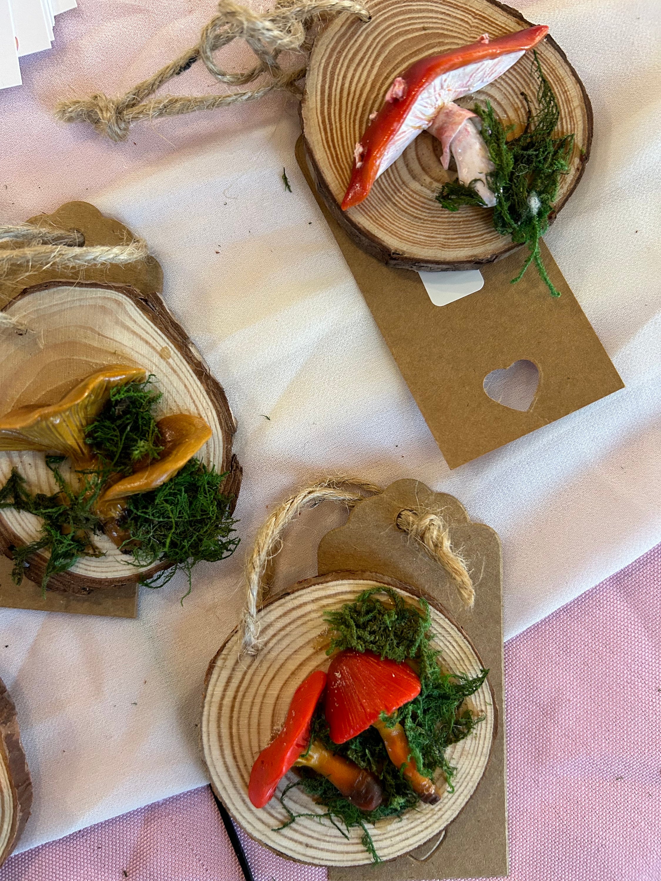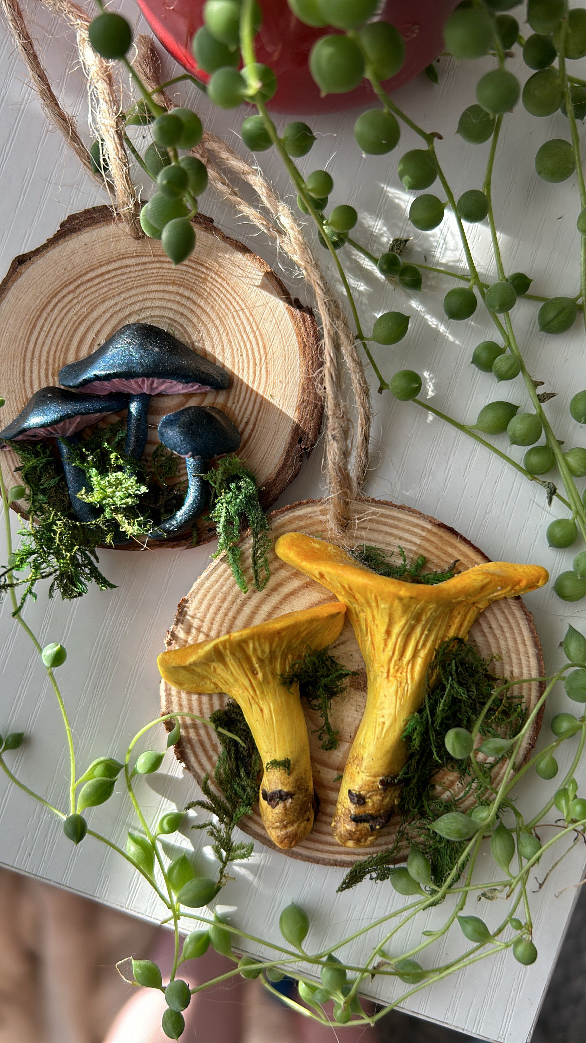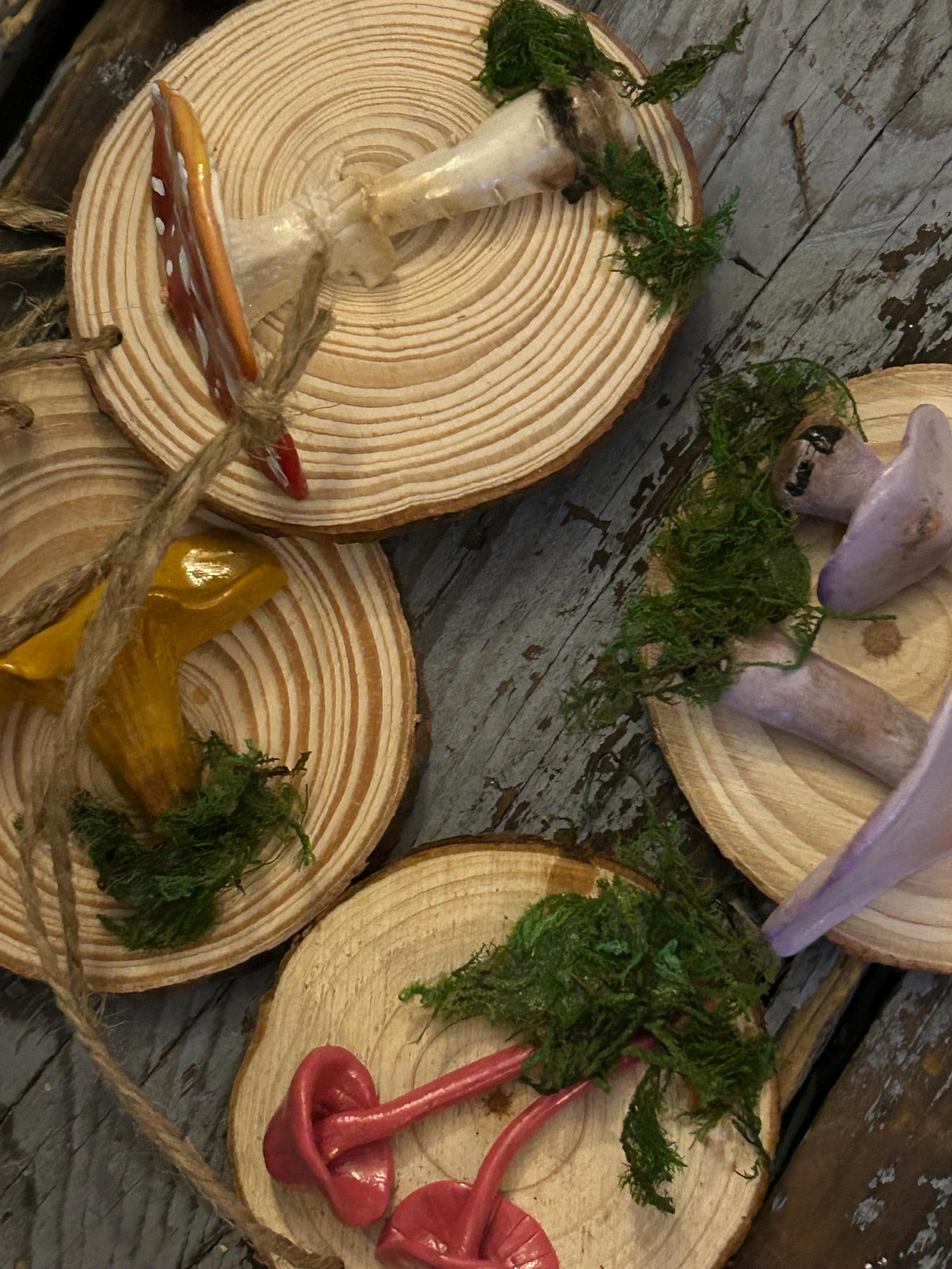 Description: Bring the magic of the forest into your home with these handcrafted mushroom ornaments! Inspired by nature, each piece features beautifully sculpted mushrooms mounted on rustic wood slices, accented with moss for an enchanting woodland touch.