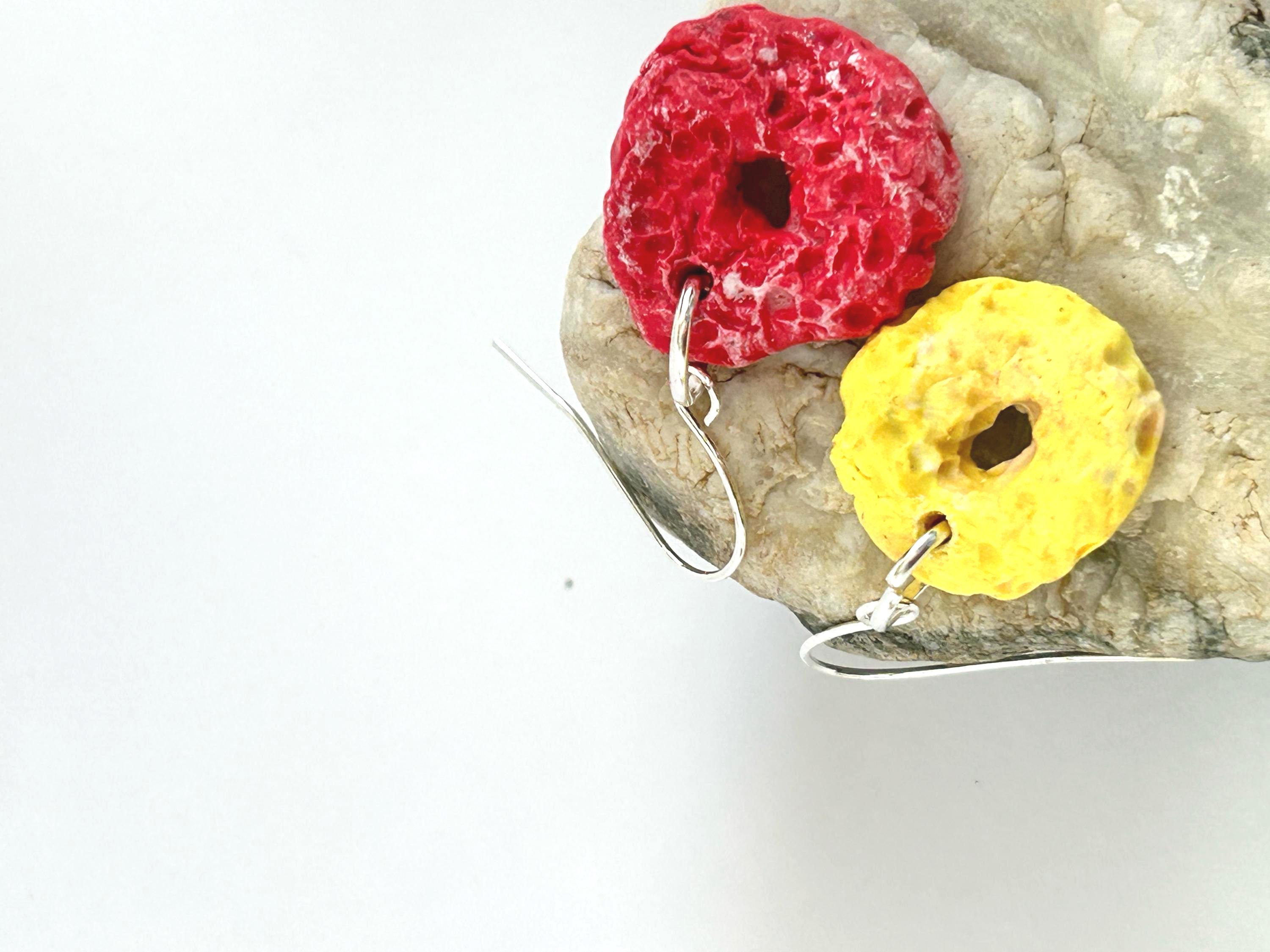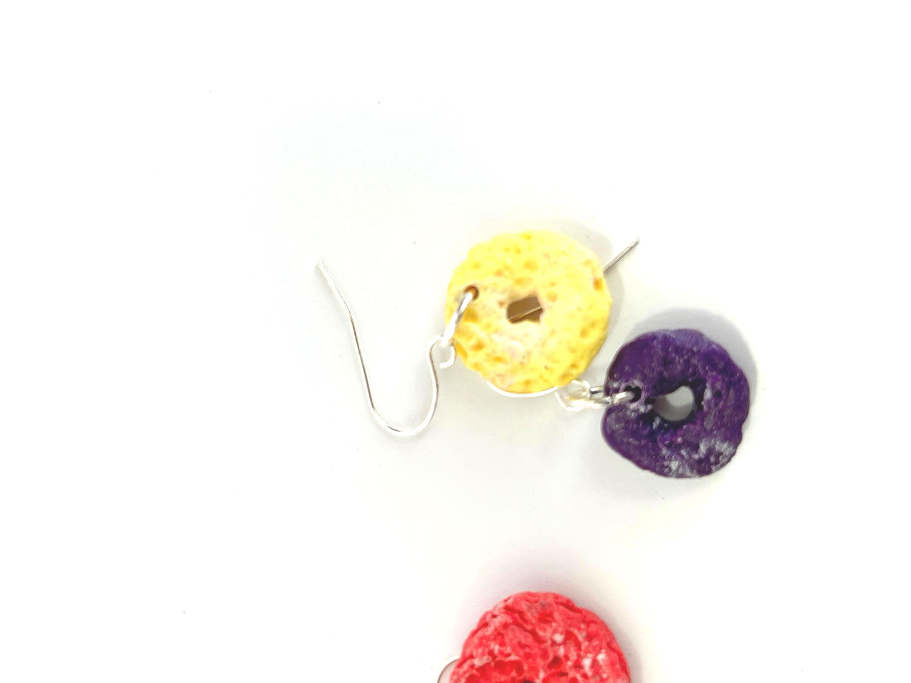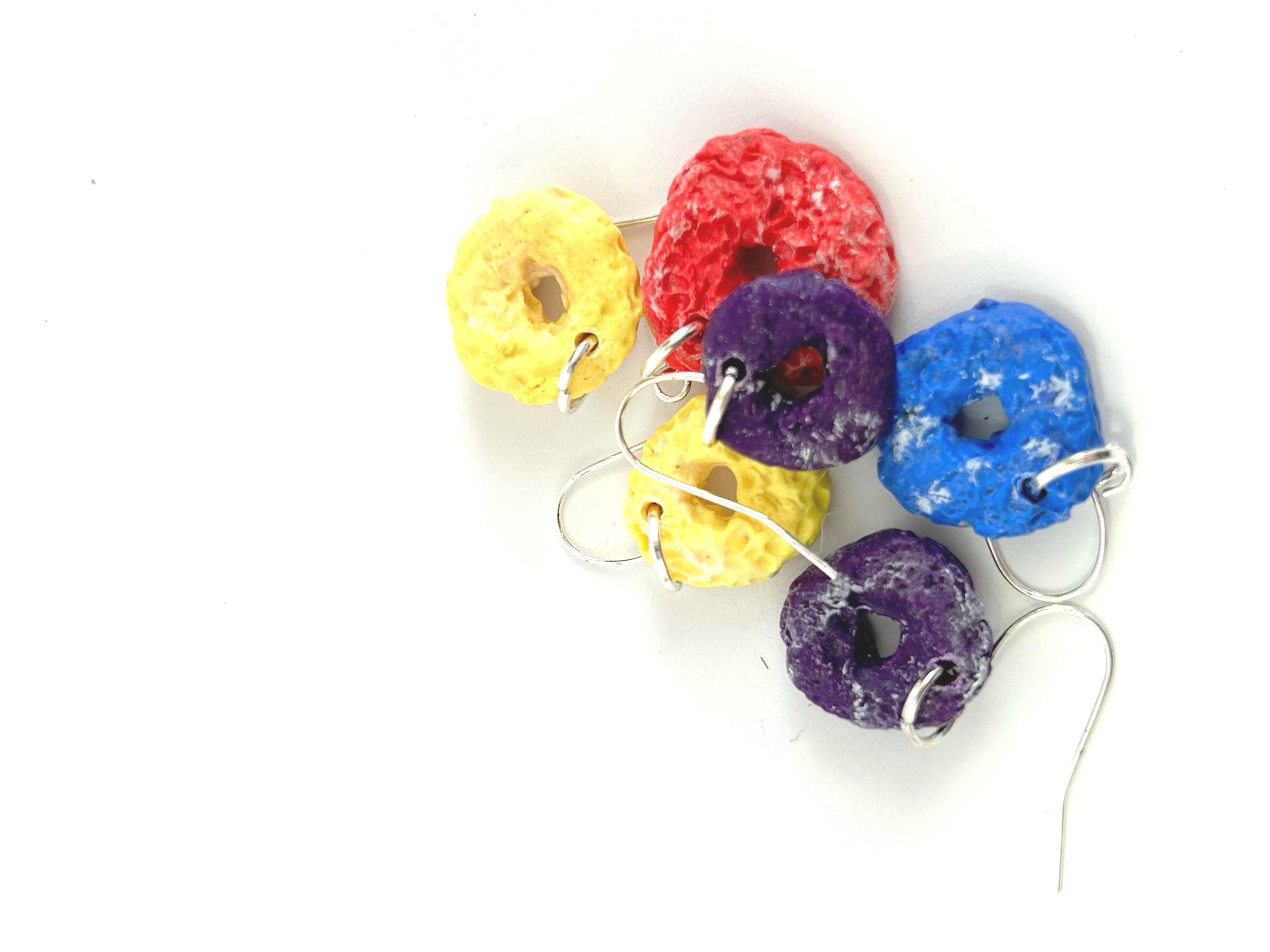 These handmade polymer clay earrings are inspired by everyone’s favourite fruity cereal. Each earring is carefully sculpted and textured to look just like a Fruit Loop – colourful, playful, and perfect for making a statement.