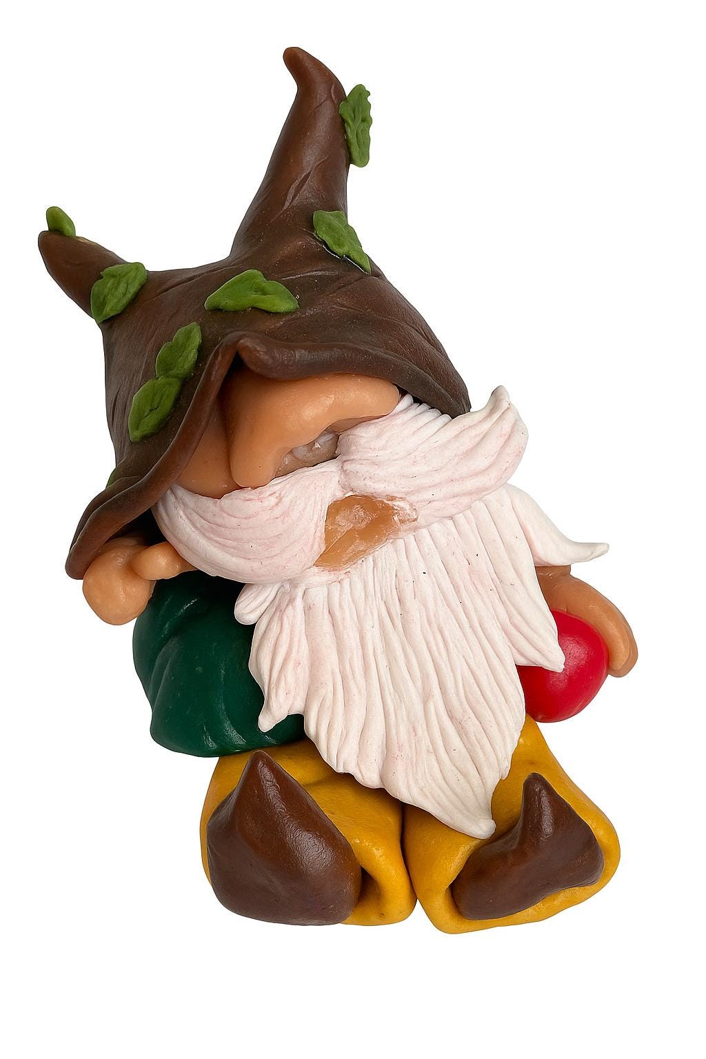 ✨ Features: • Handmade from polymer clay – one-of-a-kind • Features: leafy forest hat, long white beard, autumn boots, and a little red toadstool tucked at his side • Approx. [4 inches/2 inches] • Sturdy enough to perch on shelves or windowsills • One-of-a-kind (no two gnomes are the same!)