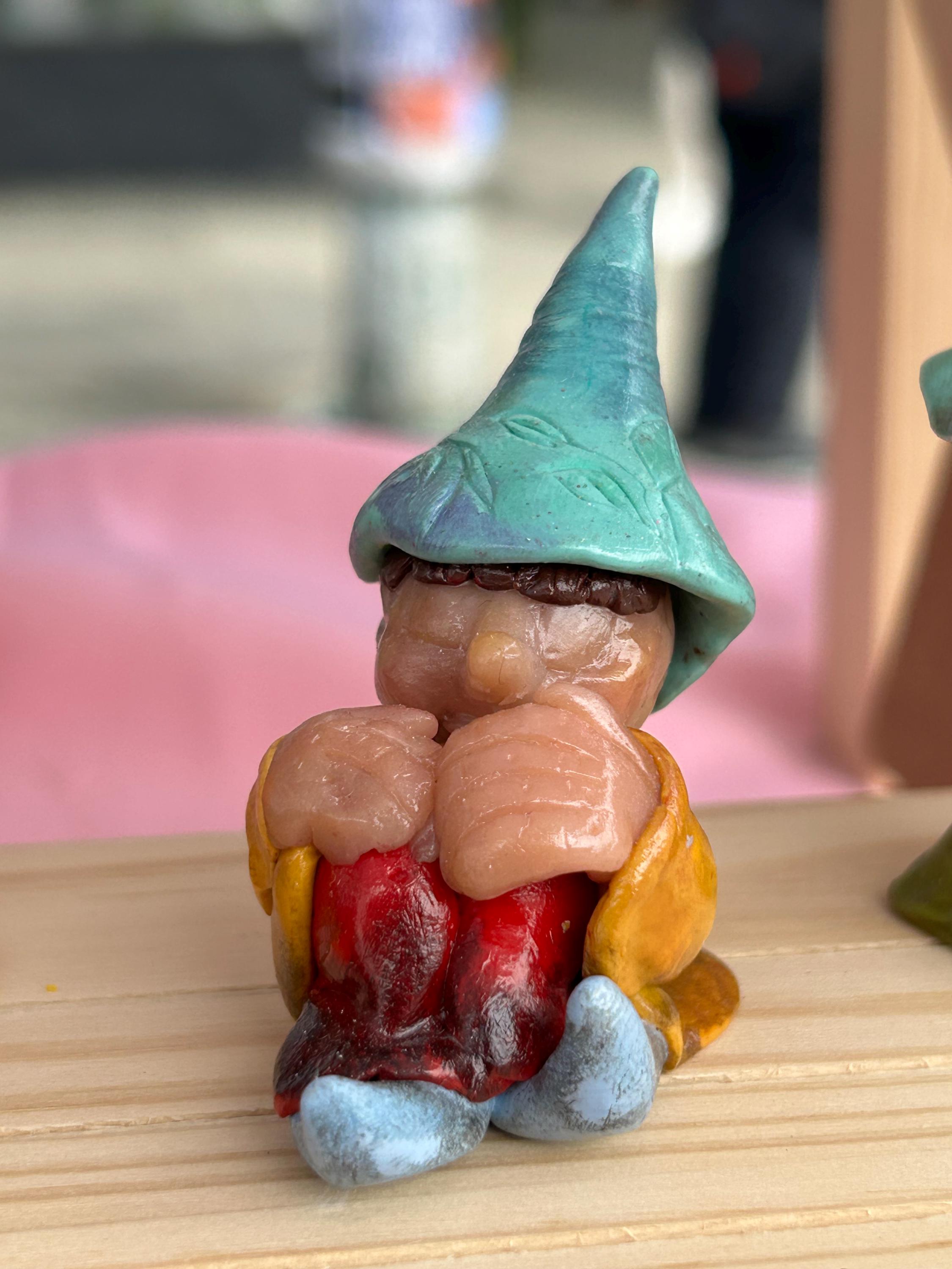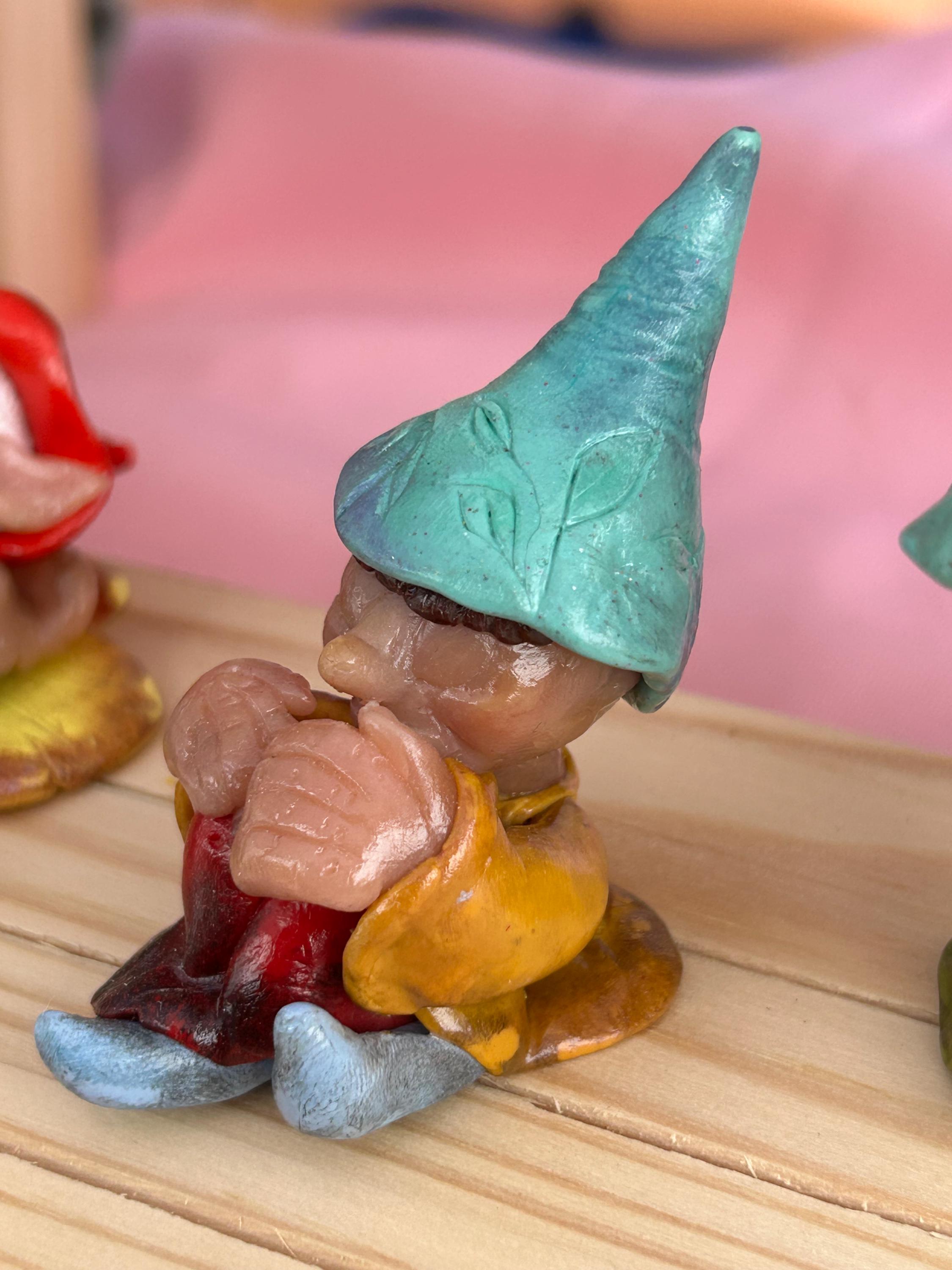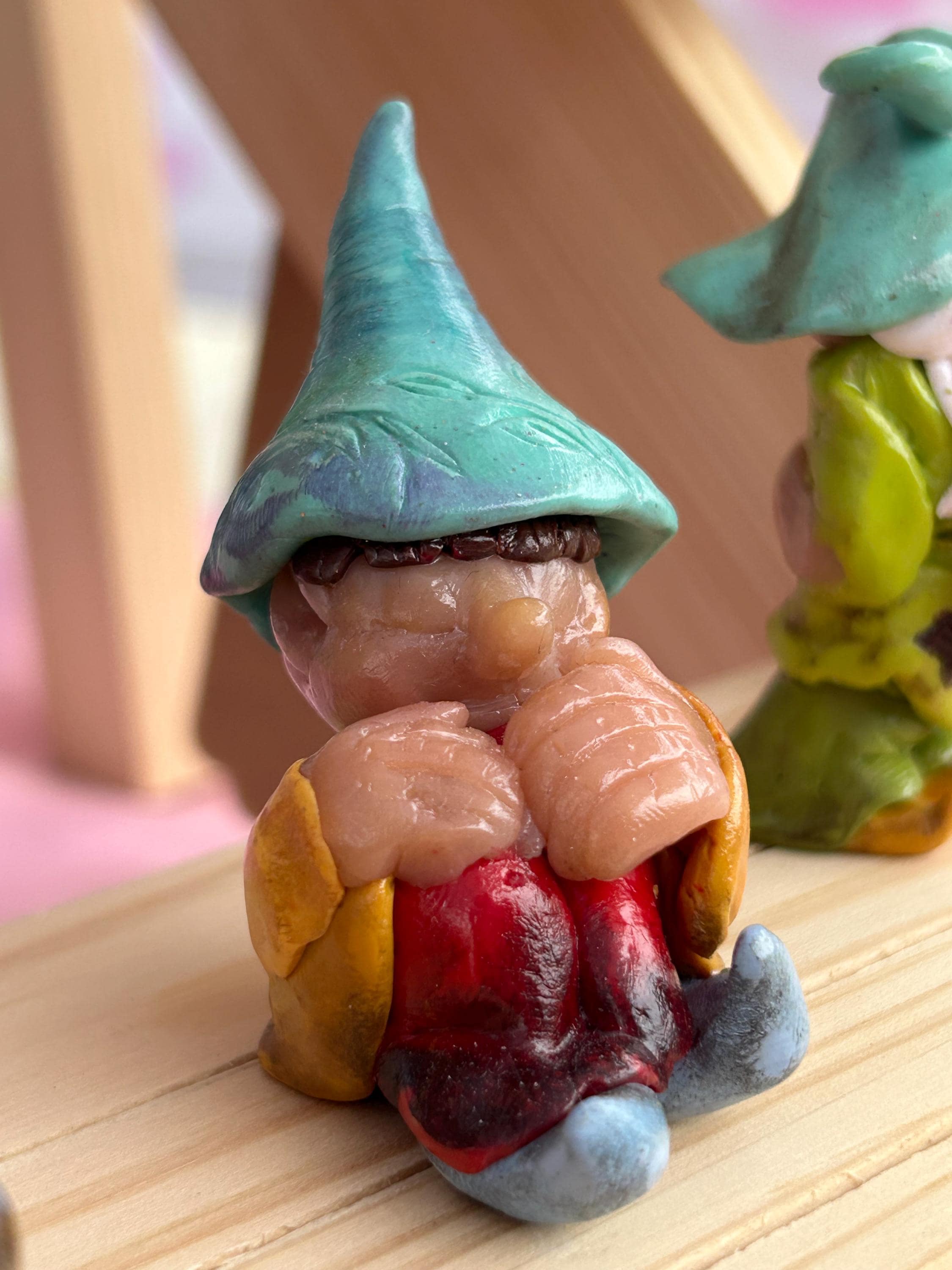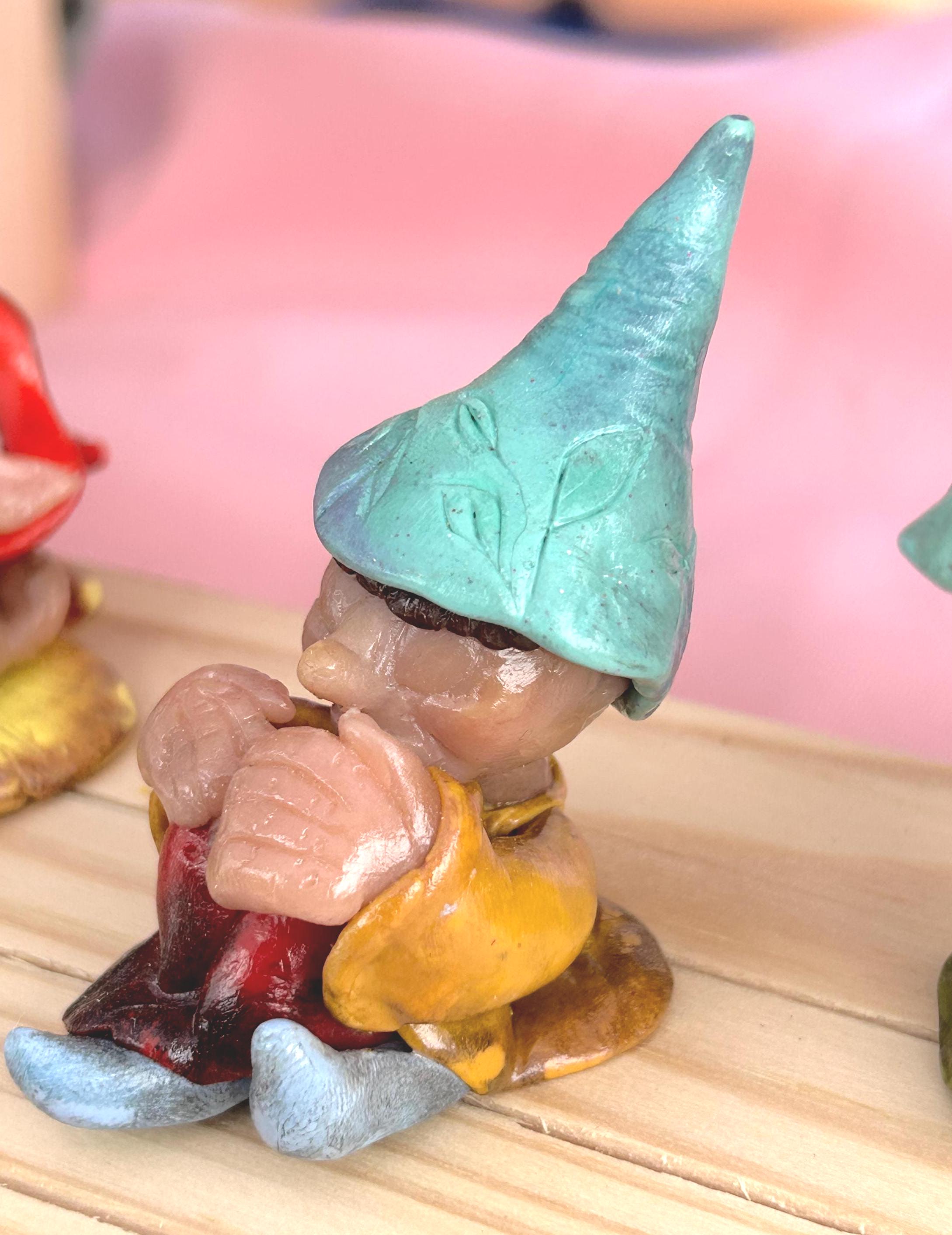 ✨ Details: • Handmade from polymer clay • Approx. [3 inches/2 inches] • Lightweight and durable – sits steadily on shelves or flat surfaces • Each one is unique, just like the gnomey thoughts in his little head