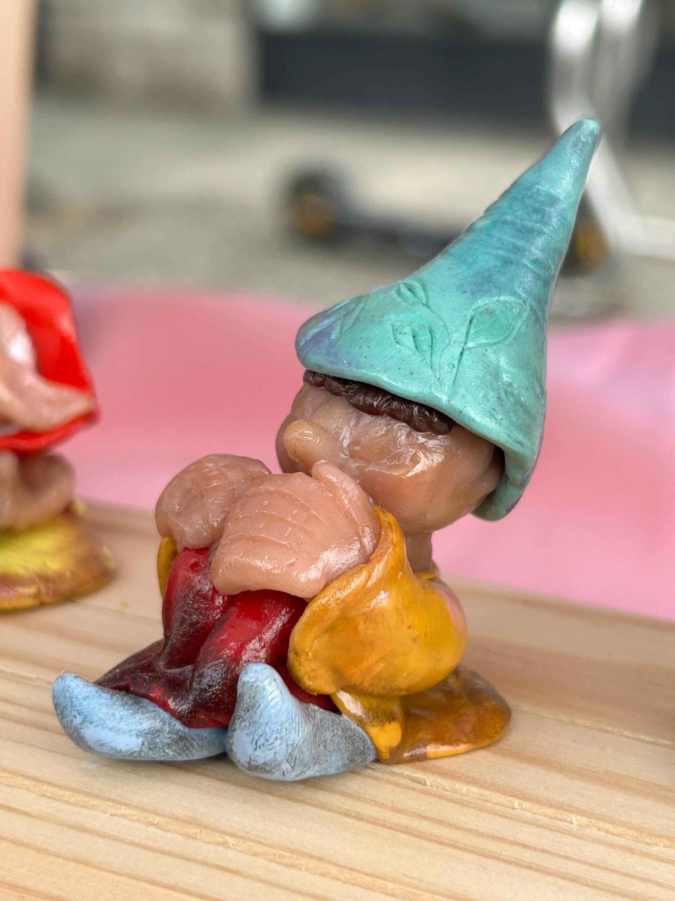 This little gnome has found the perfect spot to pause and ponder. With his knees tucked in and arms wrapped around them, he’s the picture of quiet contemplation—maybe dreaming of mossy meadows and mushroom stew. Hand-sculpted from polymer clay, he’s full of charm, character, and a touch of woodland wonder.
